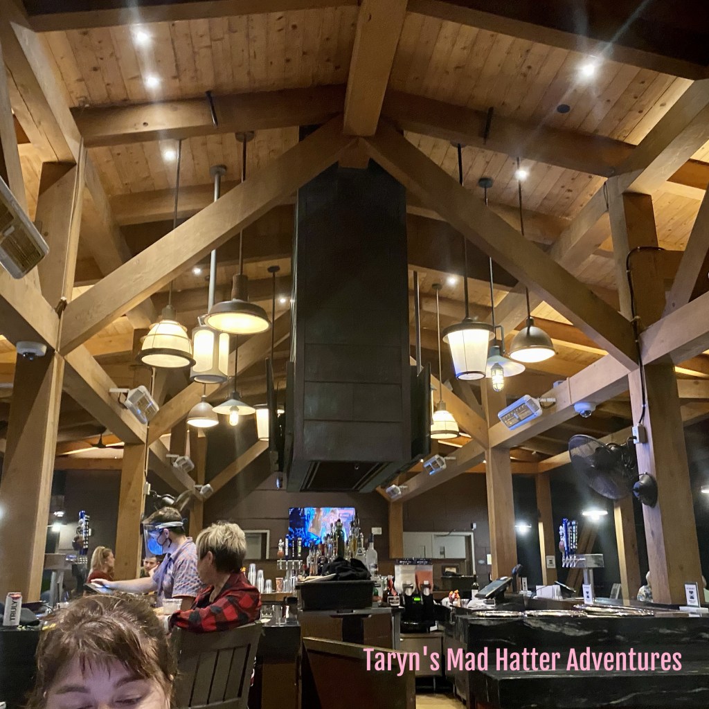 We had spent the evening at Magic Kingdom. The quick service dining locations were either closed or were getting ready to close. We decided to check out Geyser Point Bar & Grill, located at Wilderness Lodge (which is where we were staying.). We were exiting the park and on the boat at 7:55 p.m. Just as we were getting to the Wilderness Lodge, the heavens opened up and it was a complete monsoon! Luckily we were under cover at Geyser Point. We were told there was a 40 minute wait. We ended up only waiting 15 minutes. Every table was full! Besides normal tables, this location also has some more casual seating and bar seating.