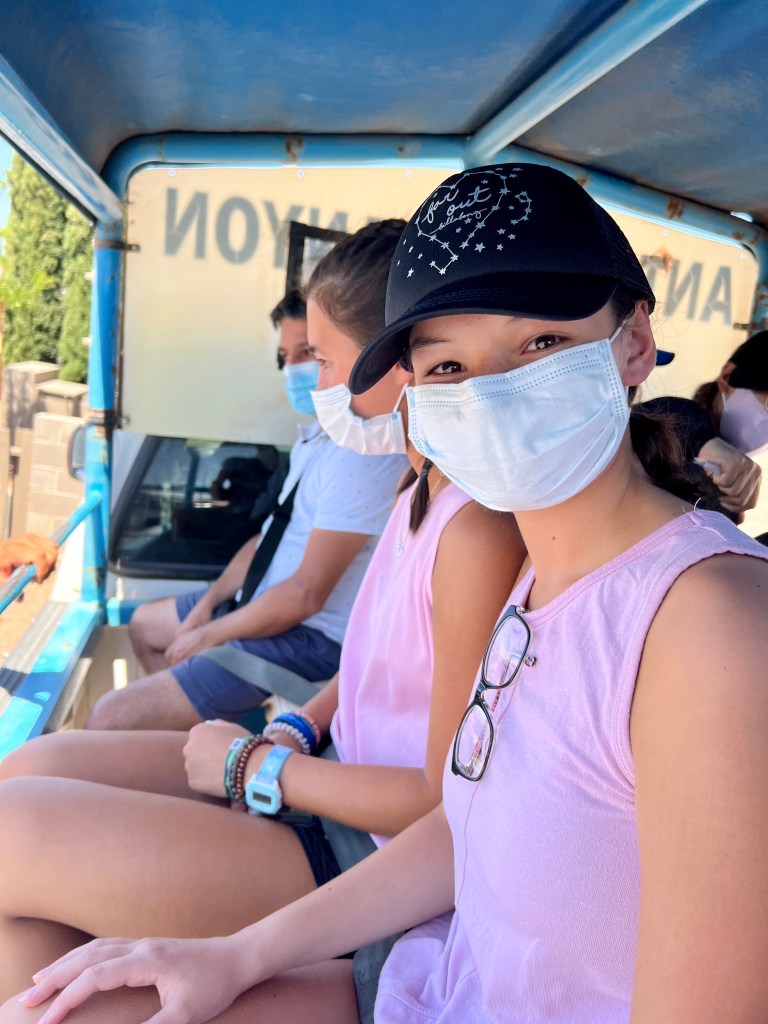 Right at 2:00 p.m., the tour guides started shouting out their colors and we were grouped accordingly. We boarded these open air trucks for an approximately 20 minute drive–10 minutes on regular roads, and 10 minutes off road through the sand.
