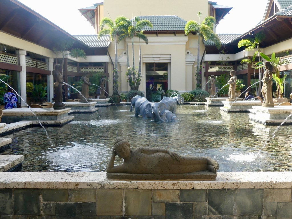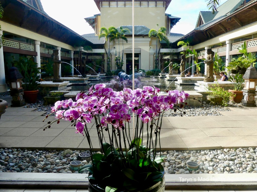 This is the little courtyard area next to the lobby. You can see the blue awning, which is where the ticket desk is, and Avis rental car is at the red awning.