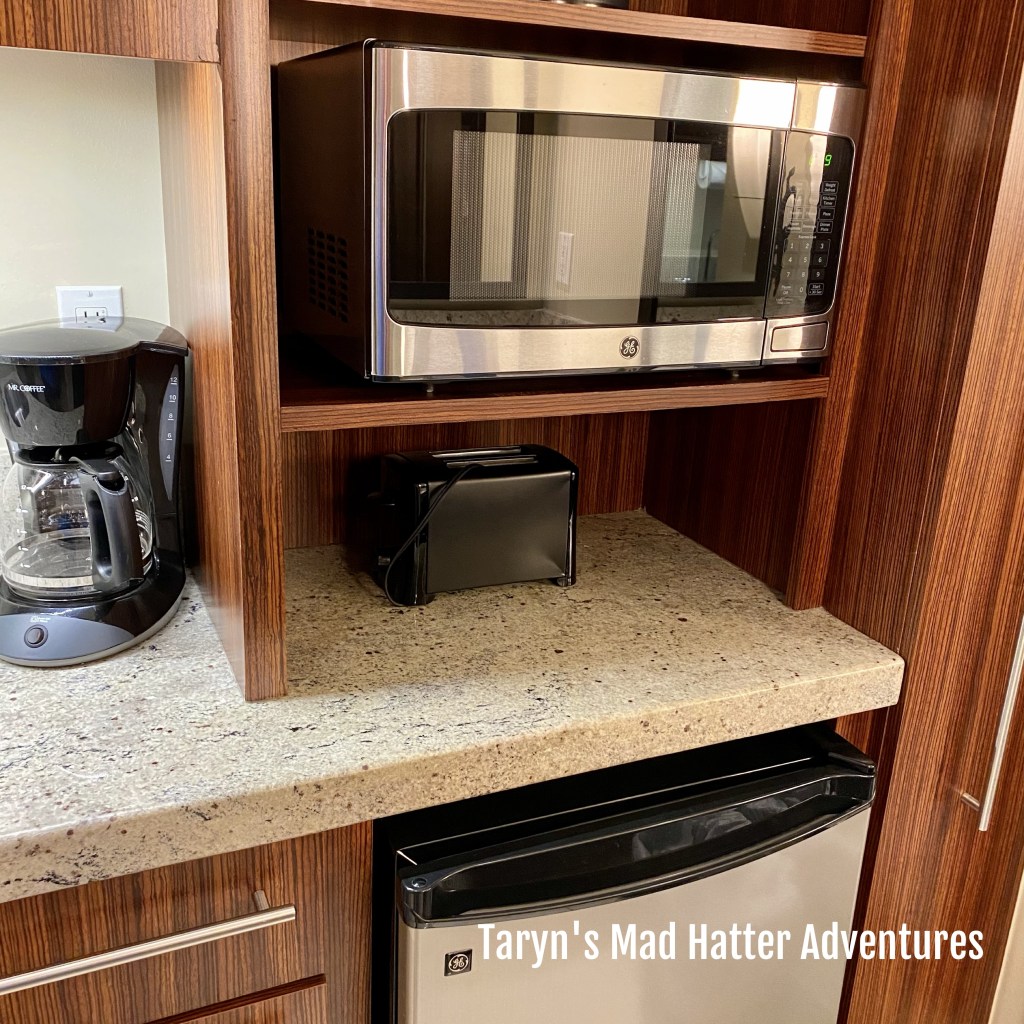Since there were only two of us, I booked a Deluxe Studio, Standard View. The Deluxe Studio offers spacious accommodations including a kitchenette with small fridge, microwave, toaster, sink and a balcony. It features one queen bed and a double size sleeper sofa.