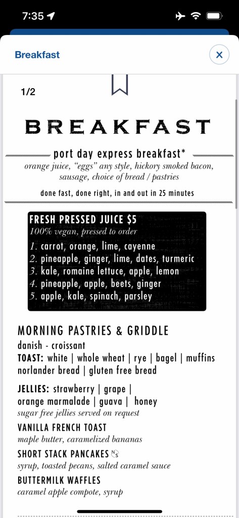 Our tour departed at 9:30 a.m., so we were up early for breakfast. We got to the main dining room around 7:20 a.m.