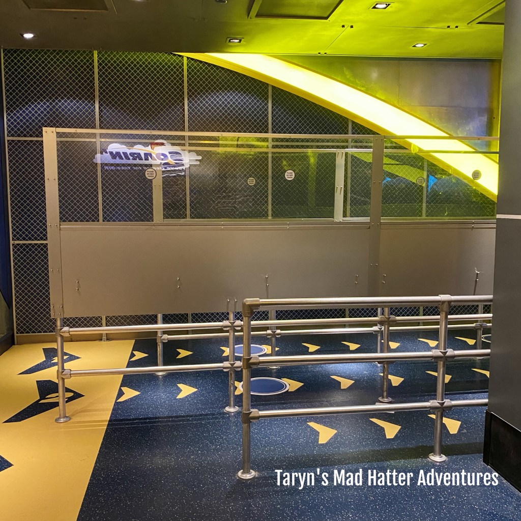 Up next are attraction queues. The above signs are all along the ground/floor. Also, they are not using every seat/row! This is Journey Into Imagination with Figment. They did only one row per car. This was the same for Pirates, Mine Train and Small World as well.