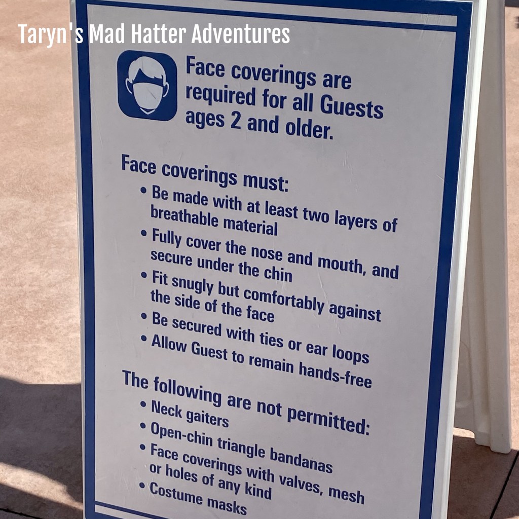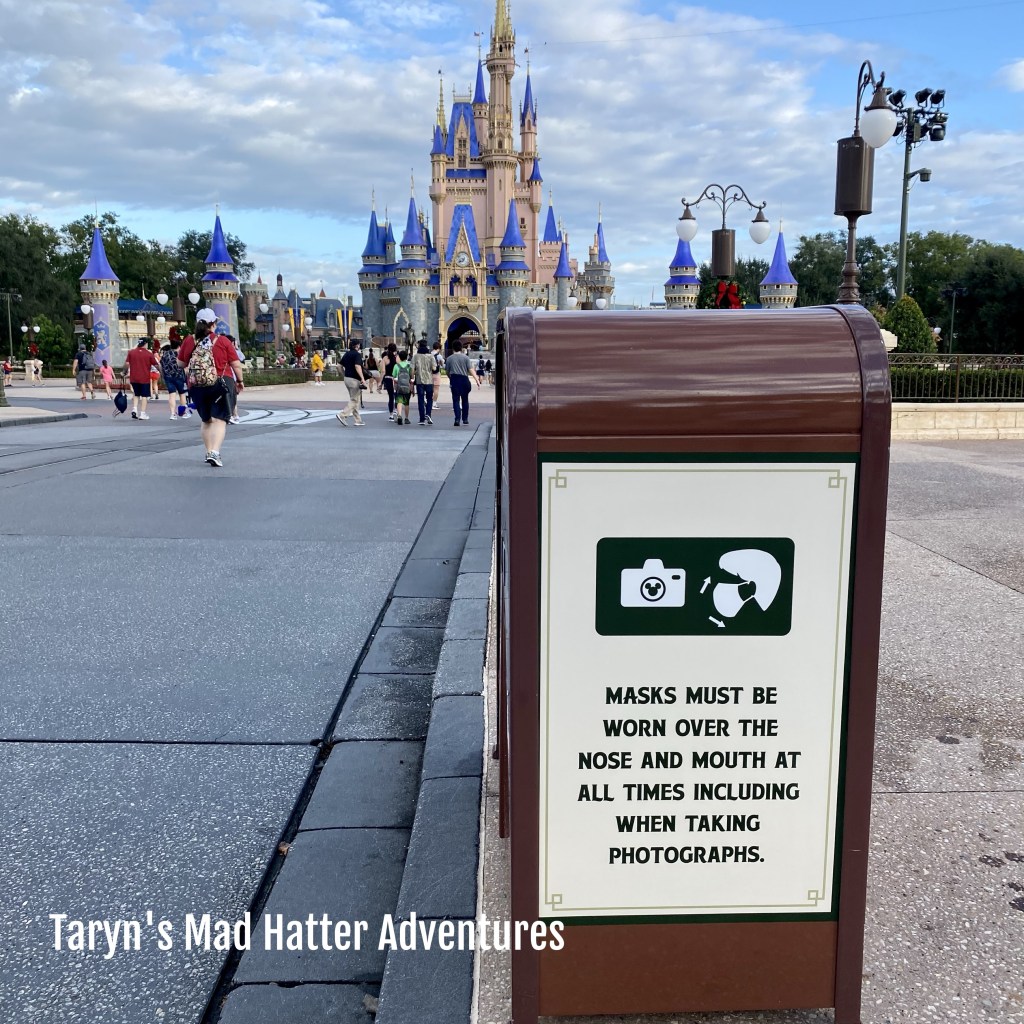 These signs are all around the popular photo taking areas. There are also cast members carrying handheld signs that say this same thing. They were approaching people who were removing masks for pictures.