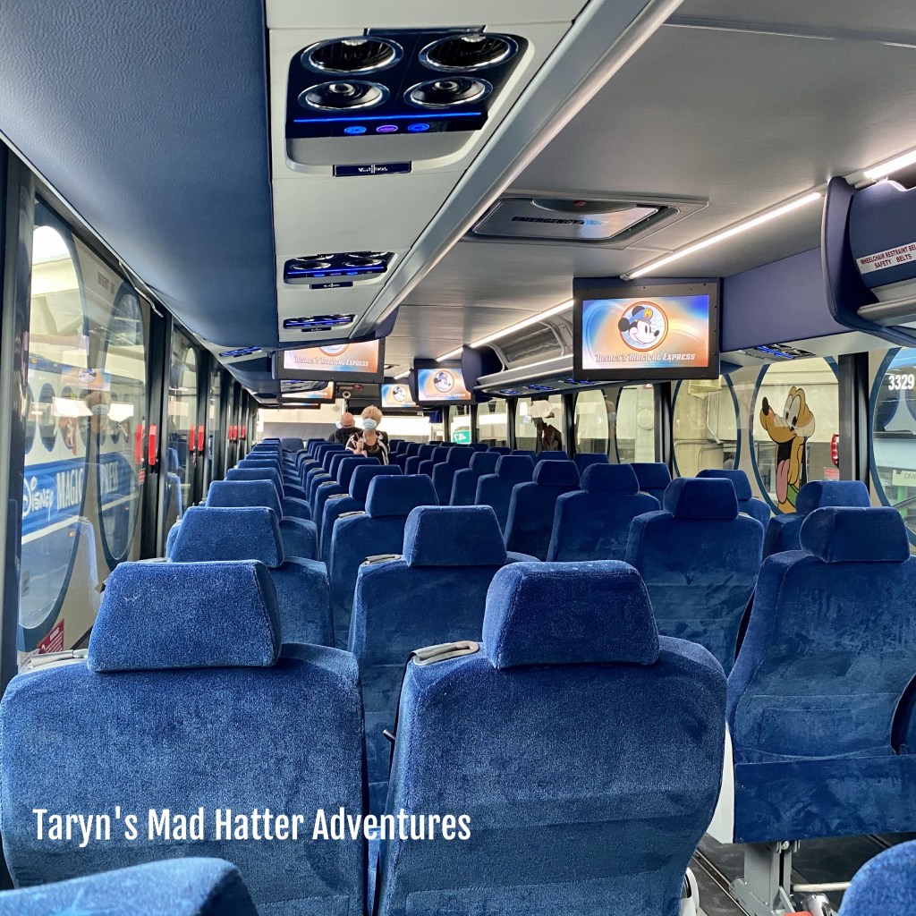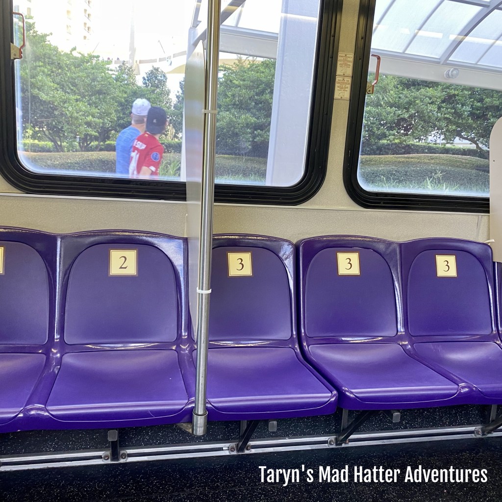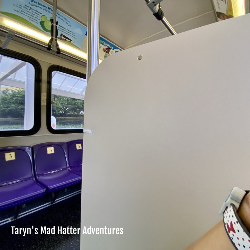 The cast member scanning our bands to enter the bus assigned us specific seat numbers. He had a map of the bus with a dry erase marker, and was marking off the seats he assigned. They are utilizing only every other row and are filling the bus from back to front. We were first in line so got the very last seats! (As a side not, there was a girl next to us who was assigned to another bus. She asked if she could sit near the front, and the cast member told her she could sit on a bench until the bus filled up and then could sit in the front. She didn’t like that answer and proceeded to the bus.)