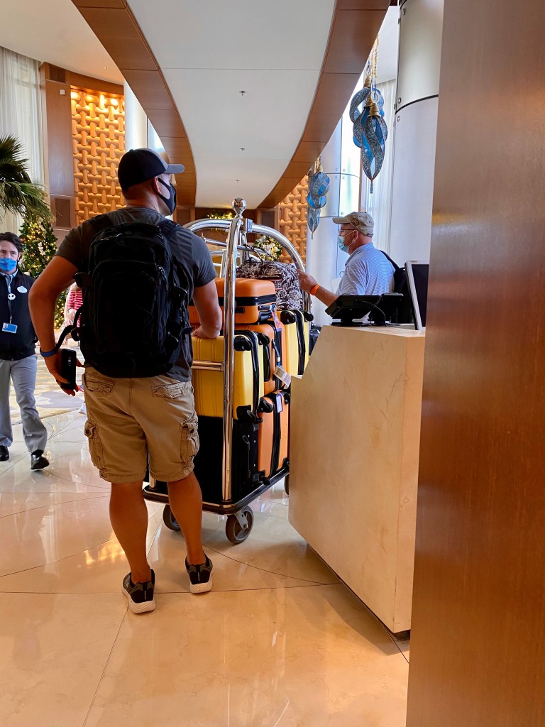 We arrived at Bay Lake Tower at 10:48 a.m. and were the first stop. We may have actually been the only stop as it seems everyone got off here… We headed into the lobby. We wanted to check our luggage with Bell Services and head to Epcot. We also wanted to change into our shorts because it was hot!