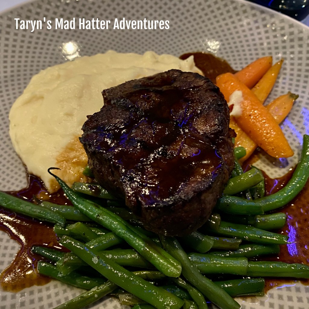 8 oz. Filet Mignon–Cabernet Butter, Potato Leek Croquette (I substituted with mashed potatoes!), Haricots Verts