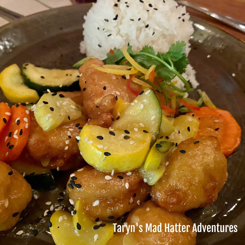 For her “regular” entree, she ordered Honey Chicken–tempura chicken, fresh vegetables tossed in honey sauce, served with jasmine rice. $20.99 This also comes with pineapple, but she ordered without.