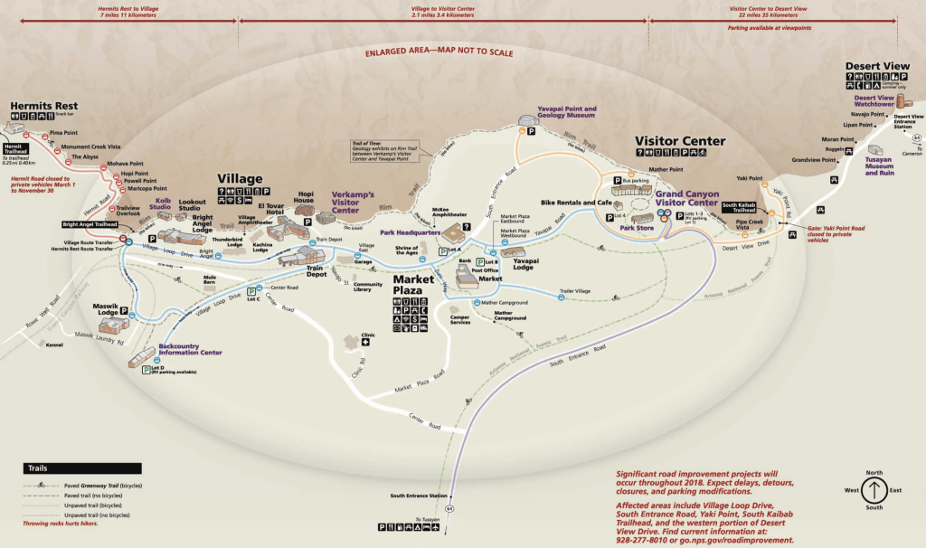 We woke up bright and early on this day and hit the ground running. Our goal was to tour the Southern Rim starting at Mather Point and head all the way to Bright Angel Lodge. You can see on this map, the location of Yavapai Lodge where we were staying, and the Visitor Center/Mather Point where we were starting.