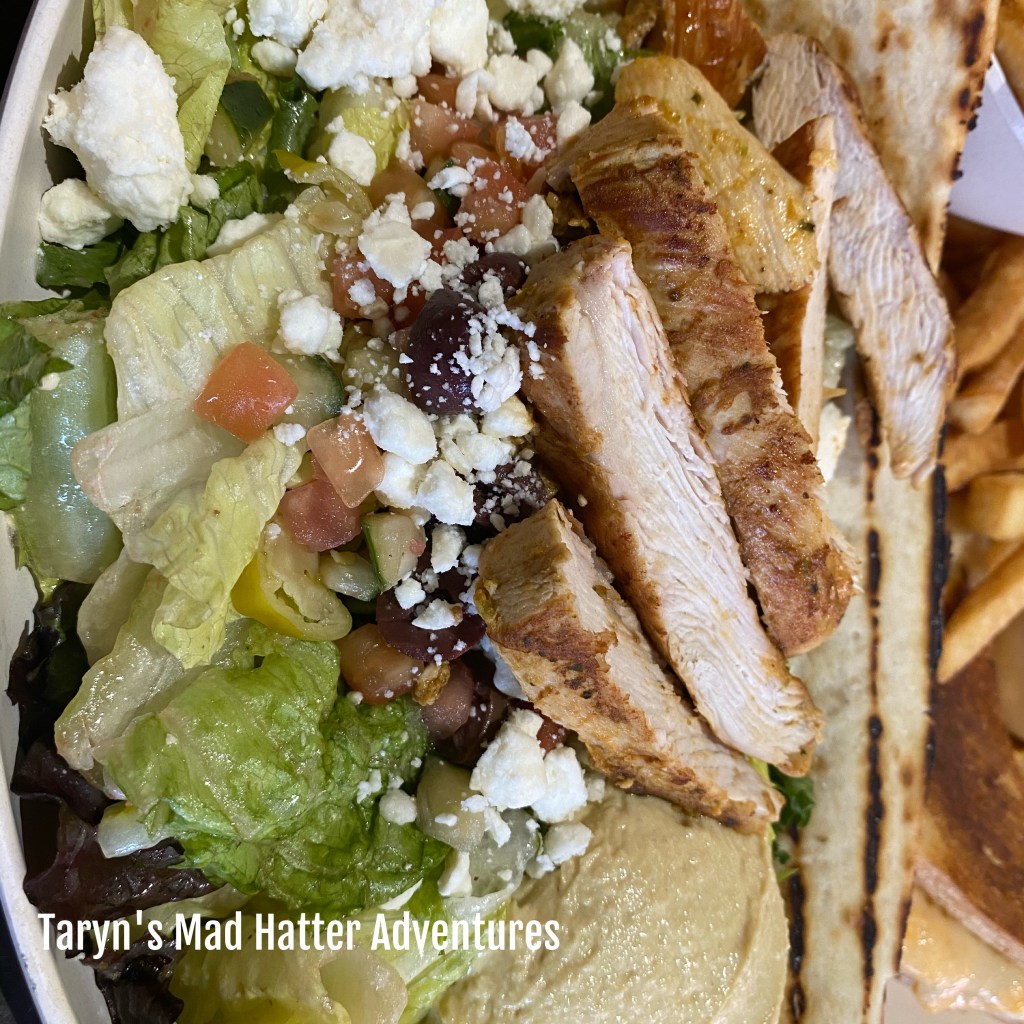 My mom ordered the Mediterranean Salad with Chicken. $11.99–Chicken breast served over mixed greens with tomatoes, cucumber, pepperoncini, kalamata olives, and feta, tossed in a Mediterranean vinaigrette with hummus and grilled flatbread.