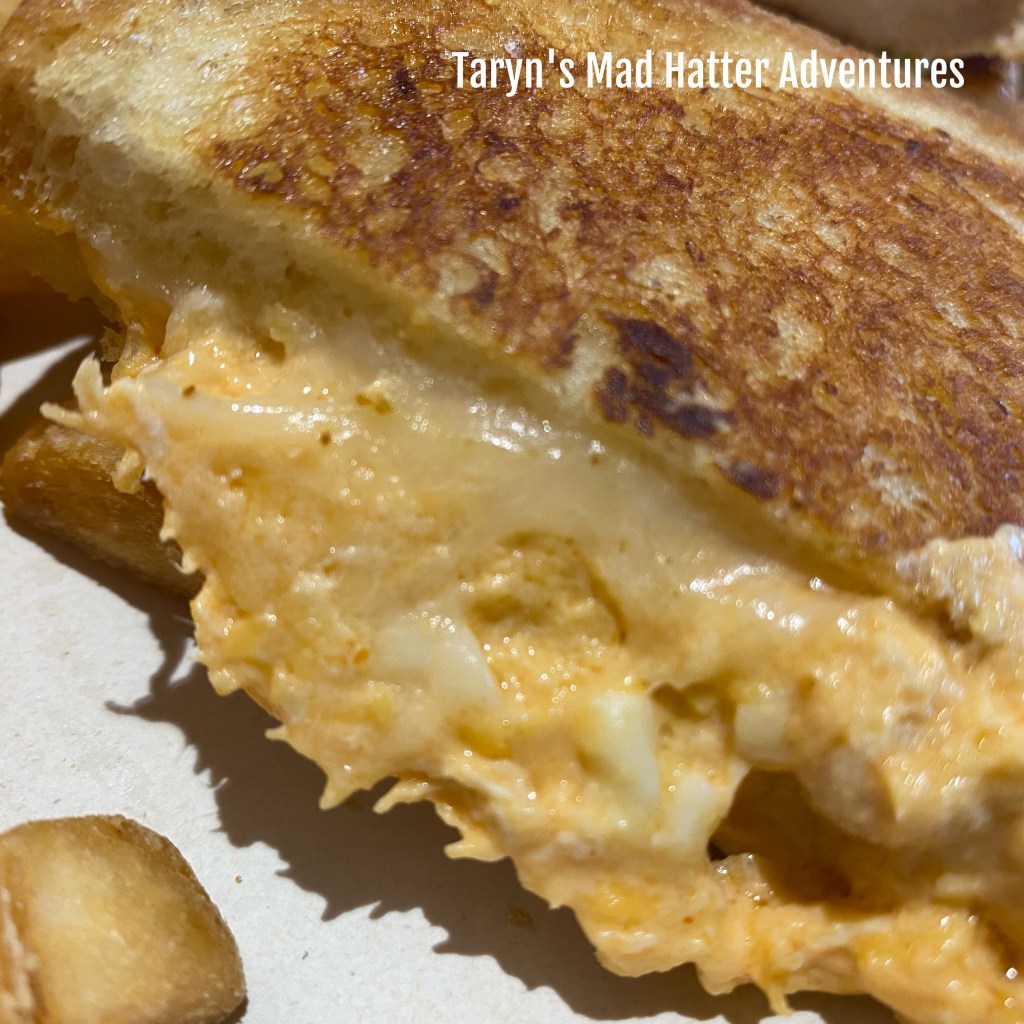 This was SO GOOD! My daughter split this with me and she also loved it. Think buffalo chicken dip inside a grilled cheese. Why haven’t I thought of this sooner??!! Here’s a close up of the inside: